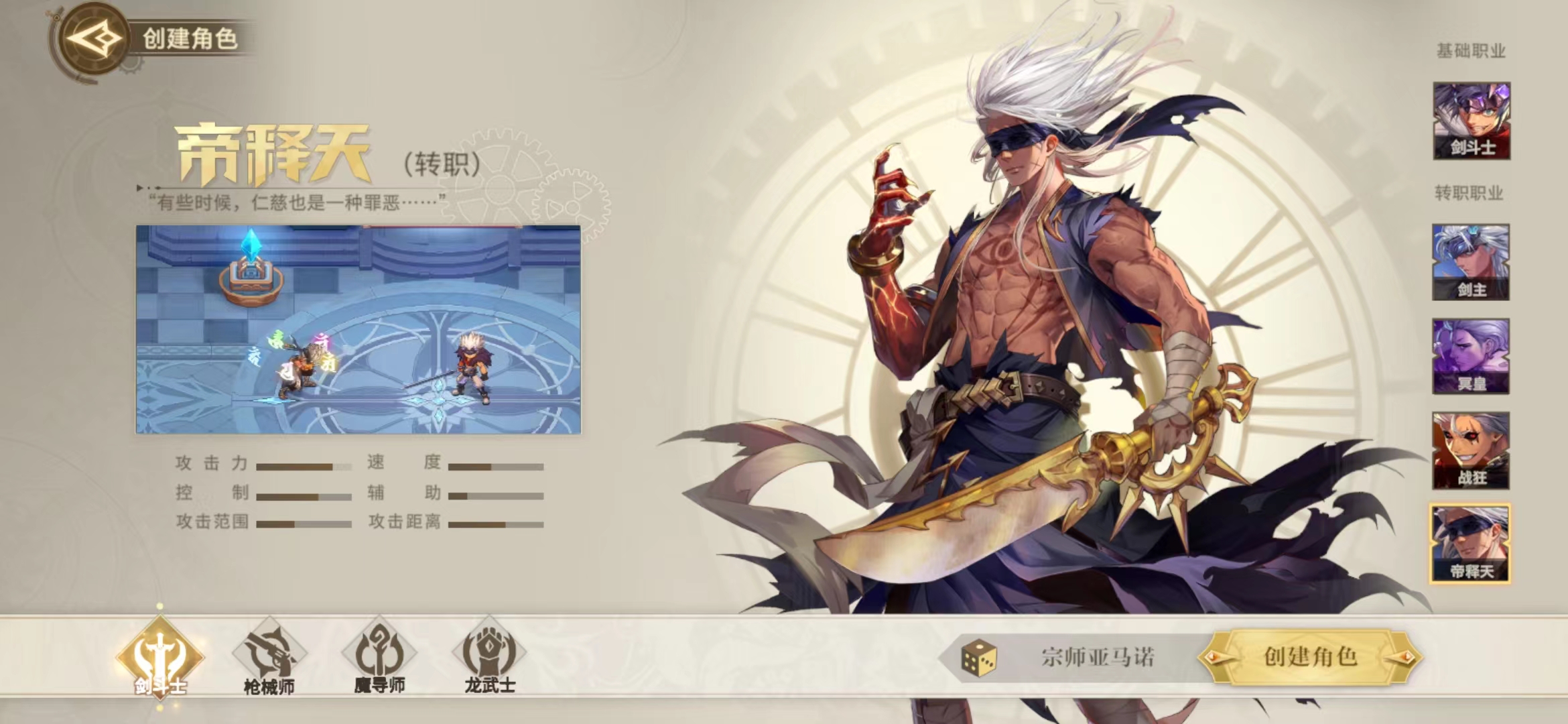 如果大家是老手的话,就建议大家去玩一下帝释天这个职业,这个职业在游戏中其实是有一定难度的,如果大家想在上面秀自己操作的话,其实这个职业就是非常适合大家体验的,帝释天的技能比较复杂,不仅在输出方式上面有远程也有近程,甚至在控制效果上面也是有一定效果的,所以在操作的时候需要玩家有比较好的操作意识,要不然技能太多效果大家记不住基本就只能去送了,要是大家对自己的操作比较有自信的话,这个职业还是比较推荐大家来体验的哦。