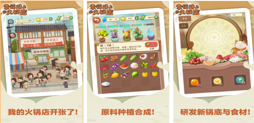 各位小吃货们一定要试试这款火锅店主题的经营类游戏,在本作中你可以随意经营自己的火锅店并获得大量资金,通过合成的方式获得食材让本作区别于一般的经营类手游,自由开发锅底和作料的设定让火锅迷们爱不释手,卡通向的背景画面和热闹的气氛渲染让人难以忘怀,这款充满幸福感的经营火锅店游戏值得大家尝试。