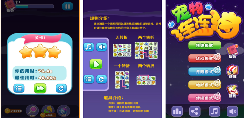 宠物连连消是款将宠物元素和连连看相结合的单机休闲游戏,趣味性十足的玩法和多元化的模式让人越玩越上瘾,卡通向的美术风格与悦耳的消除音效也是游戏的点睛之笔,玩家只需要点击两个完全一样的小宠物就能够连线消除,简单易上手的玩法和细致的教学会让你了解连连看游戏的魅力。