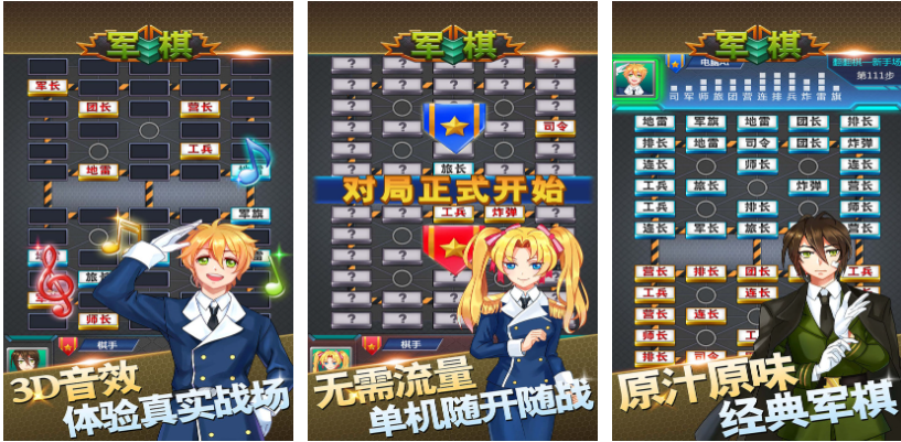 这是款专门给军事迷朋友装备的双人对弈类佳作,3D的音效和军事题材的背景塑造让人乐在其中,原汁原味的军棋玩法和独创的对弈机制也让玩家乐在其中,棋子上呈现的各种类型兵种给玩家普及了一些军队方面的知识,另类的对弈方式也让本作有别于其他棋类手游,现实中喜欢下军棋的玩家试试这款优异的对弈游戏吧。