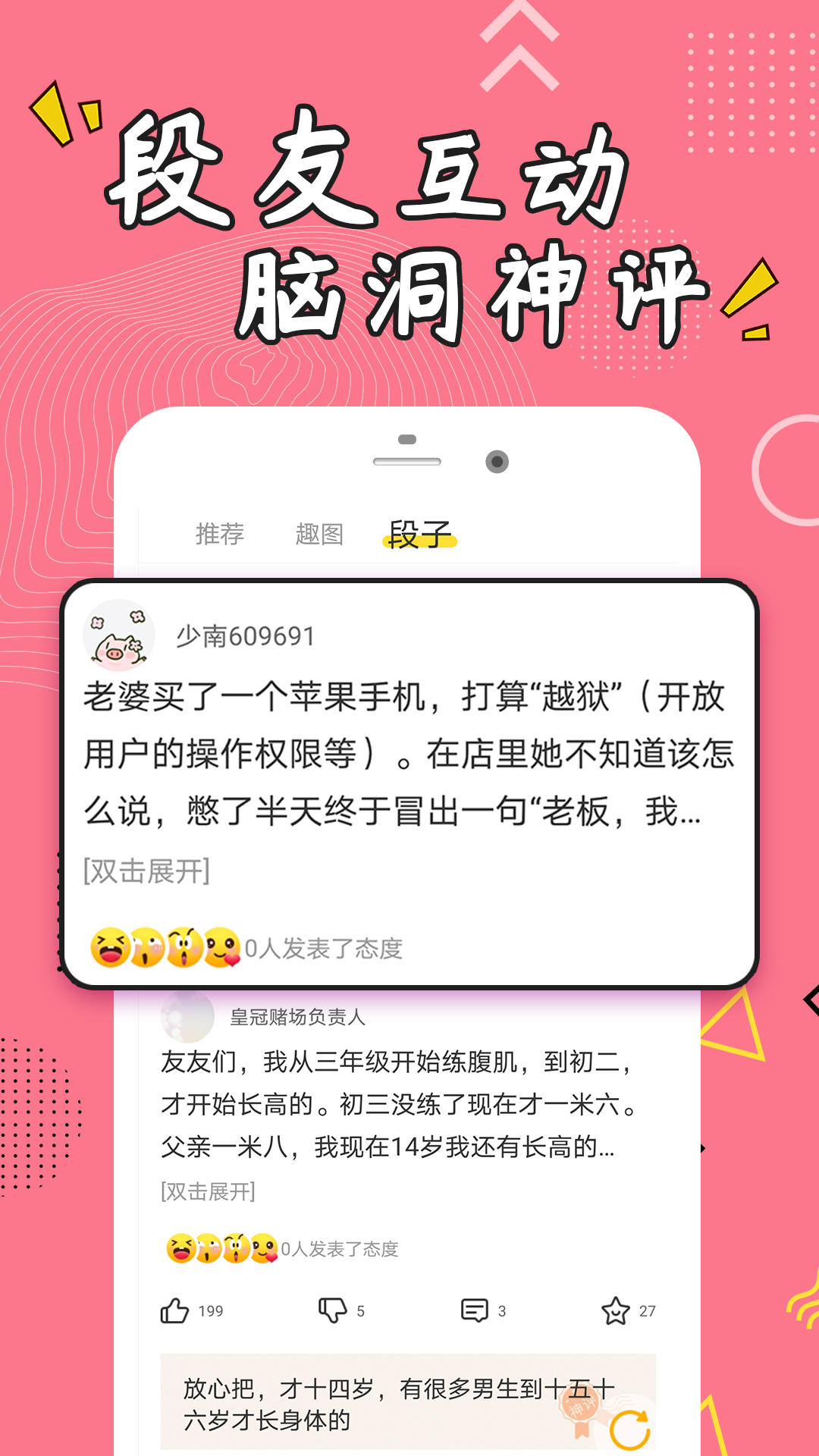 皮皮搞笑段子这款软件是一款可以让我们体验到超多好玩有乐趣内容的App软件,每个视频都会配有好笑的神评评论,能够让我们在观看的整个过程都处于一个比较兴奋活跃的状态。同时在这款软件中,各位用户们能够查看直播内容,直播间的主播会不间断的甩出各种爆笑的梗,可以让我们看得捧腹大笑。