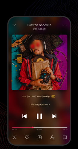 这款平台的播放界面就比较清新了,对歌曲封面进行了放大处理,可以直接看到歌曲、歌手名称,而且能够点击歌手迅速进入到详情界面。支持直接拖动进度条或者是点击歌词来定位。