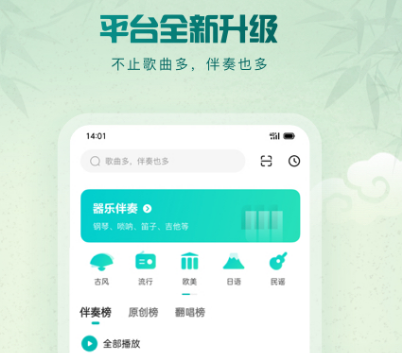 音乐软件极其丰富,每个音乐app都有不同特色,这款软件有5颗星好评,现在几百万用户都已下载,其中歌曲较多伴奏也很多,除了原创歌曲之外,还有百万首伴奏,有乐器伴奏,升降调伴奏等等。风格较为丰富,涵盖古风、流行、民谣、民族等,提供伴奏播放下载等全方面服务用户,可快速寻找到自己喜欢的内容。