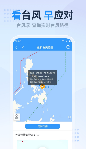 不仅能查看即时的天气,遇到暴雨天台风天还可以查看台风路径,这样上下班就能绕过台风路径顺利通勤了,还有生活指数显示,让用户日常出行更便利。