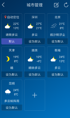 看天气的晴雨变化、看空气的湿度变化和粉尘变化都可以,各种指数清晰显示在软件上,只要定位就能了解当地天气,还能添加城市管理看其他地方的天气。