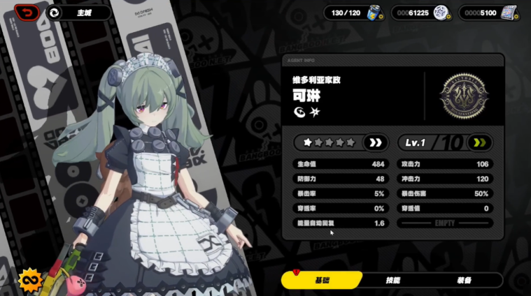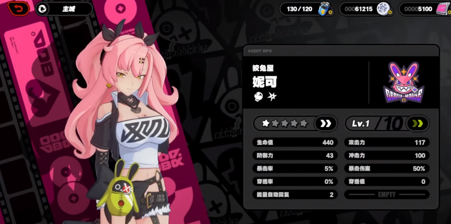 首先是安比德玛拉,她是来自狡兔屋的少女,她在一次意外中和妮可回到了阵营中。她本身的爱好是看电影,于是在生活中,她老是像在表演电影一样对待生活。她的武器是一把能够放电的长刀主要技能以斩击和上挑为主,可以使用大量的电属性物理输出伤害,并且还具有控制打断和无敌免疫的技能效果免伤。