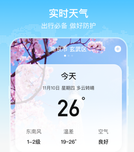 作为一款简洁清新的天气预报软件,能实时查看全国主要城市的天气信息,目前包含了全国3000多个县市的实时空气质量指数,提供高精度的天气预准。打造人性化操作体验,采取气象部门授权的预警信息,用户能够第一时间了解到最新的天气变化情况。