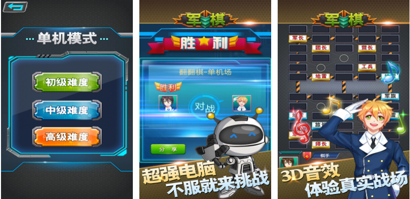 这款单机运行的军棋游戏具有公平的对弈机制,玩家可以跟电脑对手进行军棋对战,点触式的操作方式和3D的音效让游戏更具可玩性,三种难度的人机对手会手把手教你下军棋的技巧,优秀的对弈体验和舒适的游戏氛围让玩家欲罢不能,想成为军棋高手的玩家还犹豫什么?下载这款小内存纯单机的军棋游戏试试看吧。