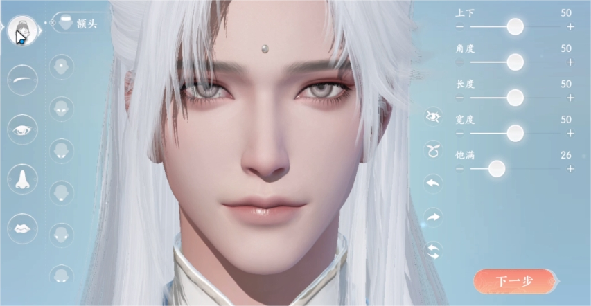 首先第一个要捏的是额头,这里的数据为“上下50”,“角度50”,“长度50”,“宽度50”和“饱满26”,前面四个都是用的默认的数据,因为这样是最协调的,最后一个饱满调成26会让角色的额头稍微显瘦一些。
