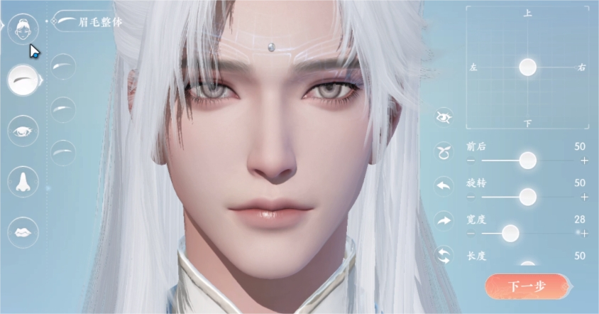 然后眉毛的数据则可以像上图这样去调整,上下左右的位置直接居中即可,然后剩下的四项数据分别调成“前后50”,“旋转50”,“宽度28”和“长度50”,这样的眉毛会让你的角色更加有神。