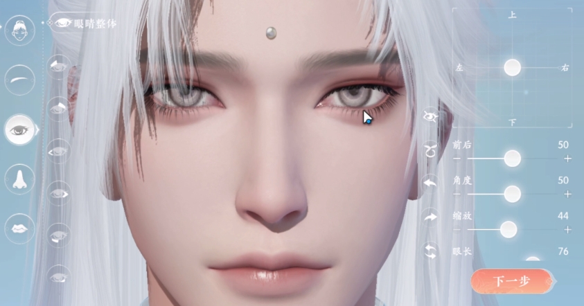 之后就是眼睛,眼睛的上下左右位置也直接用默认的居中即可,前后和角度则调成50,剩下的缩放和眼长则分别调成44和76,这样可以让你角色的眼睛更具有美感。