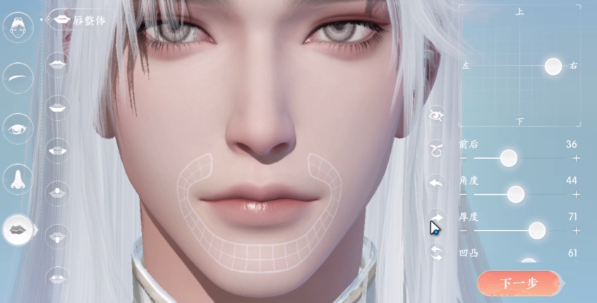鼻子的话则完全不用改,直接全用默认就好,位置居中,前后,角度,长度和饱满也全用50,最后的嘴唇则需要大改一下,把它的位置调整到偏右,然后剩下四项数据调成“前后36”,“角度44”,“厚度71”和“凹凸61”。