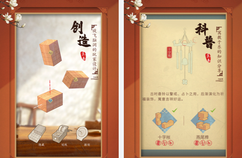 是一个非常烧脑的小游戏,在游戏中会把传统的卯榫技术有效结合解谜的关卡,在这个游戏中玩家看到的是一些比较普通的木头,但是可以发挥个人的想象力,把这些木头全部结合在一起,打造出不一样的形状去组合成不同的艺术品,如果玩家对游戏有兴趣,不如就去感受一下吧。