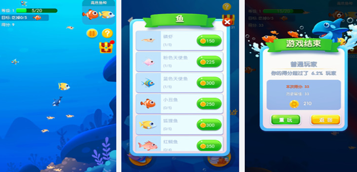 游戏中可以让大家感受到大鱼吃小鱼,主要是控制一大群的鱼去吞噬一些小鱼,慢慢的将增大鱼的体积。在吞噬小鱼时别忘记去躲避鲨鱼的攻击,需要灵活的控制小鱼在当前的屏幕中。可以提供的鱼类种类非常的多,包括鲤鱼,海星等。整个游戏无论是画面还是声音都显得独树一帜,里面还会融入一种与众不同的魔术效果。