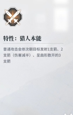 猎人本能:它又是一个特性技能,其出处是四星雷系角色艾摩诃,这一角色手持弓箭,所以技能描述中也不可避免的会提到箭矢,其特性技能的效果是普攻会对目标依次发射1,2,3支箭,不过后续第二次和第三次攻击时的箭矢会有一定程度的改变,其中第二次的伤害减半,第三次则会呈扇形散开,但综合来看其整体伤害还是非常可观,毕竟这是为数不多的三连击招式。