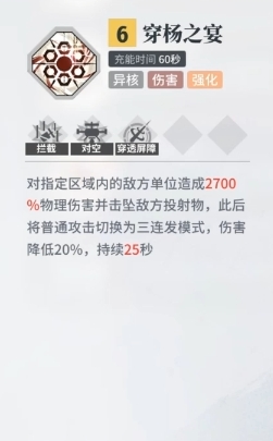 穿杨之宴:它同样是一个异核技能,其主要作用是伤害和强化,其出处是四星物理角色狄砚,它的效果表现为对区域内的单体敌人造成2700%物理伤害,并且可以击落敌人的投射物,所以是一个兼具输出和防守的强力技能,同时使用后角色的普攻还会再后续的25秒内获得强化。