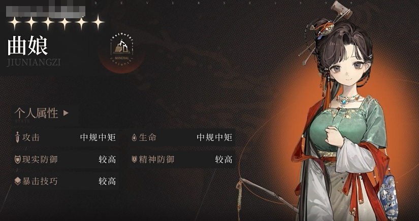除了这两项相对普通的属性以外,曲娘的其他三项属性都很高,包括现实防御,精神防御以及暴击技巧都是非常不错的,可以让你在使用她的过程中感受到充分的坦度和爆发能力。