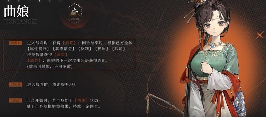 特性方面,曲娘的三种洞悉均有不同效果,首先一阶段的效果有两种,第一个是战斗开始时获得“酒浆”buff,该buff能够让她的下一次攻击周瑜得到强化,并且该强化可以不断叠加,且不能被驱散。另外洞悉1还能让曲娘在回合结束后根据己方全体的各种状态数量还获取额外数量的酒浆,所以搭配特定队伍,她的酒浆层数将迅速叠到一个十分夸张的地步。
