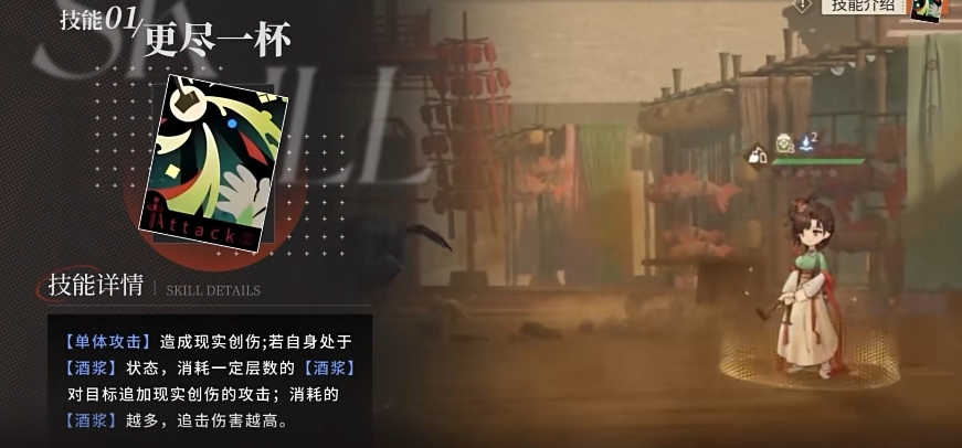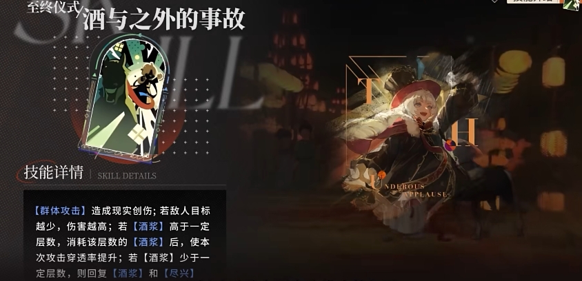 不过这招用完后曲娘会进入醉意状态,这个状态没法使用技能,同时也没法行动,这个状态只会持续一回合,后续升阶可能会提升,但被至终仪式攻击后会直接解除。