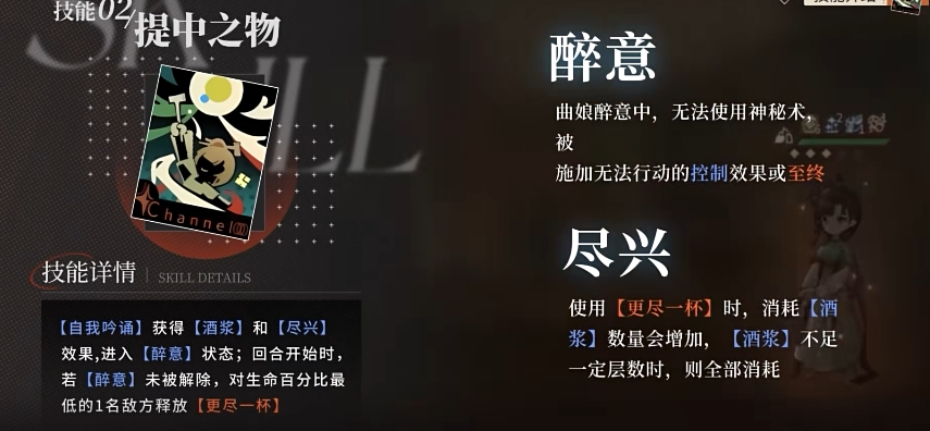 二技能的名称则是“提中之物”,其效果是通过自我吟诵来获取“酒浆”和“尽兴”两种效果,其中酒浆的效果不必多说,新增的这个尽兴状态它的效果是增加一技能所消耗的酒浆数量,因为该技能原本是有一个消耗上限的,有了它以后就可以突破这个上限,让一技能的增伤效果来到一个新的高度。