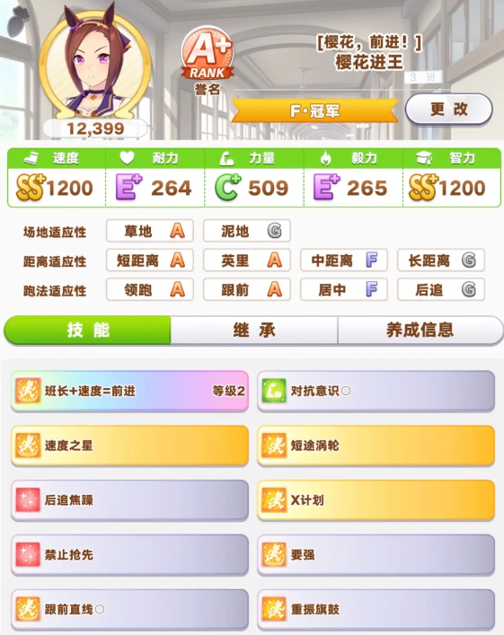 【樱花进王】这是游戏中一个初始赛马娘,需要大家去进行养成,在游戏中,樱花进王自身的数值还是非常不错的,而且是初始阶段,短跑能力最强的一个选手之一了,性格上也是比较急躁;比较适合选择在草地上进行比赛,而泥地则非常的不擅长!在比赛期间可以选择安排在领跑的位置,因为自身的技能【学习委员长】可以在比赛最后阶段时,自身的排名如果比较靠前的话,那么就会触发这个技能效果,速度加快,爆发力加强!