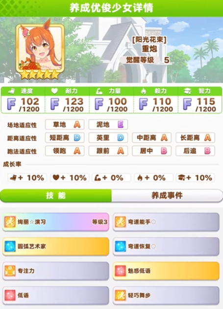【花嫁重炮】这个重量级的选手可不一般,在游戏中算是综合能力比较强的一个马娘了,比较适合中距离和长距离的比赛,而且在草地上的大型比赛有一定的压制力,这也跟自身的技能数值有关系,比赛中,推荐大家去选择作战的位置可以是领跑或者跟前!这个赛马娘的强度主要体验在了灵活变换的技能和操作上,在比赛中,会根据自身的心情来更换跑步的速度,虽然强度比较高,但是这个比赛的成绩比较不稳定,所以大家可以选择培养这个马娘去参加一些专属的养成比赛!主线的比赛就不推荐使用重炮了!