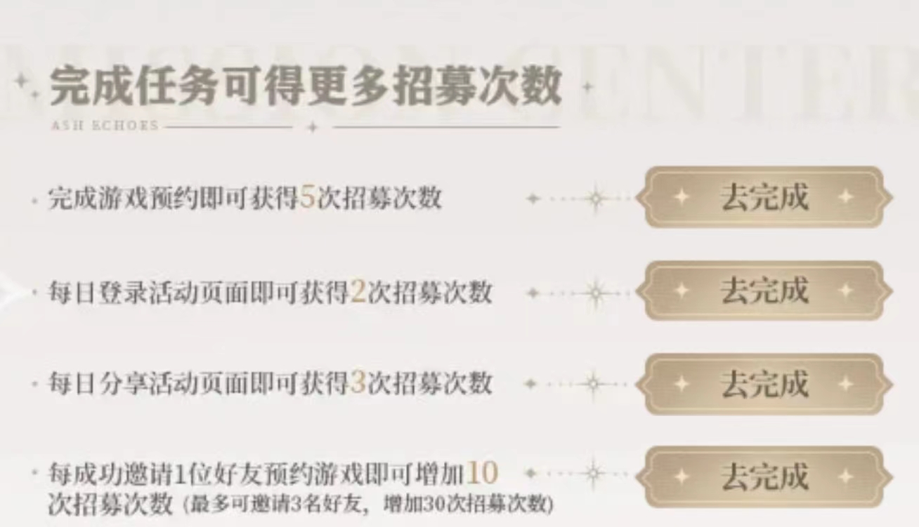在游戏当中玩家们使用招募次数之后,主要可以抽取到四名不同的角色,他们分别是吉娜,芙蕖,司危和比戈尼娅,这四个角色在卡池当中是主要的奖品,玩家们抽到角色之后就可以解锁角色并且带领角色进入到游戏进行作战,而在活动期间玩家们只需要每日登录到游戏的活动界面就可以获取到招募的次数,将游戏分享给好友也可以获得招募次数,这些都是一些比较简单的获得任务。