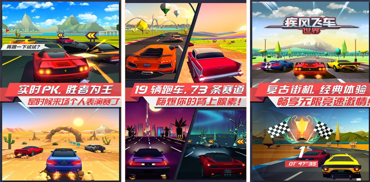 疾风飞车世界是款质量绝佳的街机风格3D竞速类手游,一流的引擎技术和碰撞效果让本作的刺激性直接拉满,多样化的赛事和十几款酷炫赛车可供朋友们自由选择,引擎的咆哮声和重金属的背景音乐相得益彰,赛道上刻画的各个城市的著名景点也让人叹为观止,十分简单的操作系统和复古街机的美术风格也是本作的神来之笔。