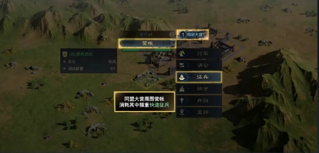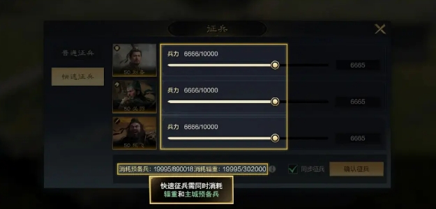 在消耗辎重的同时也会消耗相应数量的预备兵,因此除了注意辎重是否充足外,还要注意预备兵的数量有多少,以免前期准备的预备兵不够可能征兵进行到一半就会无法补充了,但是除了在同盟城池内进行快速征兵外,营帐也是可以进行快速征兵的,这里大家注意营帐必须在同盟大营的补给范围内才能消耗辎重进行征兵。