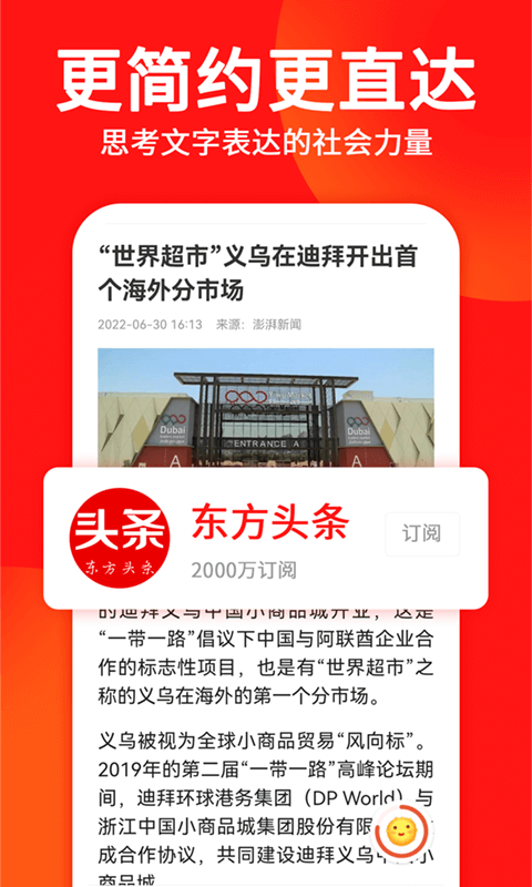 东方头条这款软件是一款可以让我们查看到深度报道专业内容的App软件,在这款软件中,各位用户们能够了解不同区域不同领域行业的新闻咨询,所以能够让人们更好地跟紧时代的变化。同时,在这款软件中各位用户们还能查看到关于一些政策发布新闻的解说内容,借助这些解说内容的帮助,可以让我们更好地剖析不同的新闻情况,了解他们对于我们生活中的实质性影响。