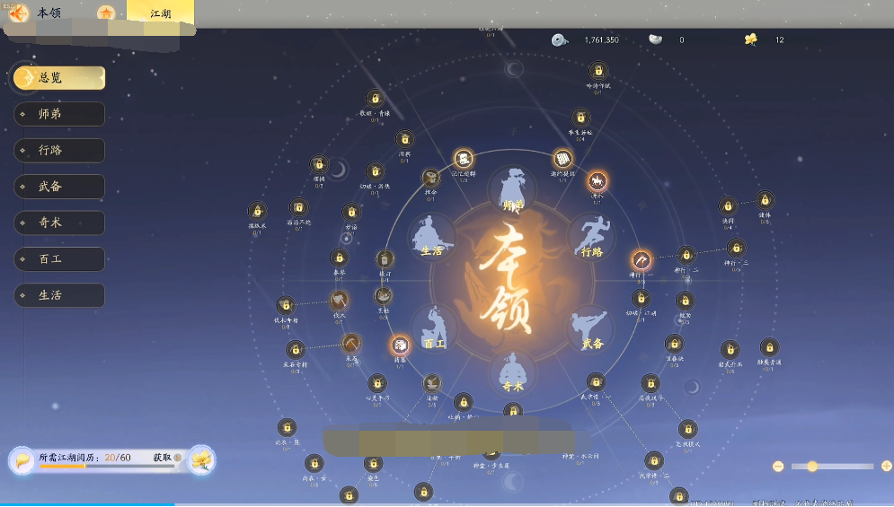 该系统就是让玩家们学习除了战斗技能以外的技巧,由生活、师弟、行路、武备、奇术、百工这六大版块组成,但学习这些技巧是分先后的,建议先点师弟系统,因为能得到额外的NPC帮助,提醒玩家按时完成任务,增加背包的容量,在完成吟诗作赋时获得提示等。
