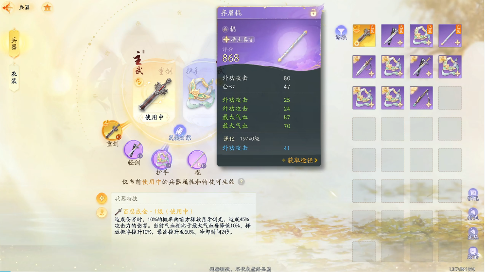 游戏为了让玩家们轻松掌握对角色的操作,设置了自动攻击的战斗系统,只需要一直点击挑战的BOSS就行。角色最重要的修行方式是“武功境界”,提升境界需要领悟值,在大世界探索并完成任务就可以获取,是达到不同境界的唯一方法。每位角色要佩戴两把武器,在重剑、轻剑、棍、护手四把武器中选择两把,金色品质的武器是最厉害的。
