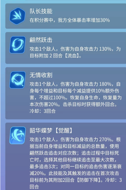 欧菲莉亚的大招是目前所有技能中唯一一个具有实际攻击力的技能,攻击目标敌人使整体伤害能提升到270%,并且根据buff叠加的效果来进行追击。换一句话说就是目标敌人的负面效果越多,欧菲利亚所获得的追击攻击次数就会增加,并且还会使对方的防御力下降。