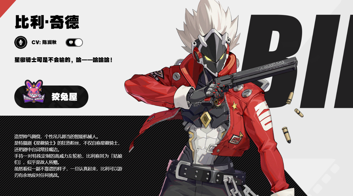 第二个角色的名字叫做【比利奇德】。比利奇德是一名风流倜傥的机械人。他看上去是一名非常不靠谱而且中二的“二次元”,口中整天念叨着喜欢的剧目的台词,这个样子看上去滑稽极了。