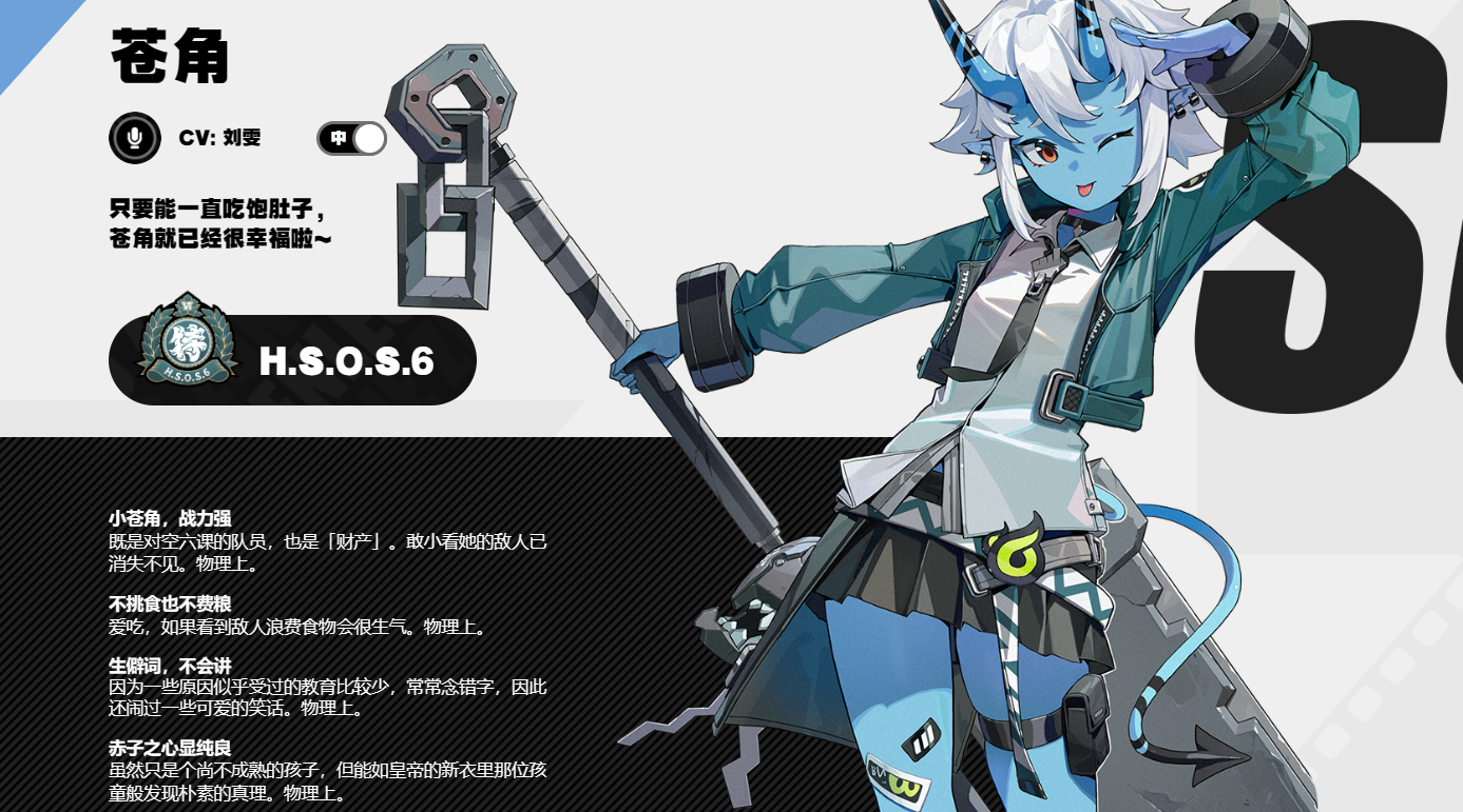 第三个角色的名字叫做【苍角】。苍角是一名拥有蓝色皮肤的特别小孩,他是对空六课的队员的成员之一,被他们称为“财产”。苍角的战斗能力非常的强,小看她能力的人们迟早在一场战斗中会被她折服。