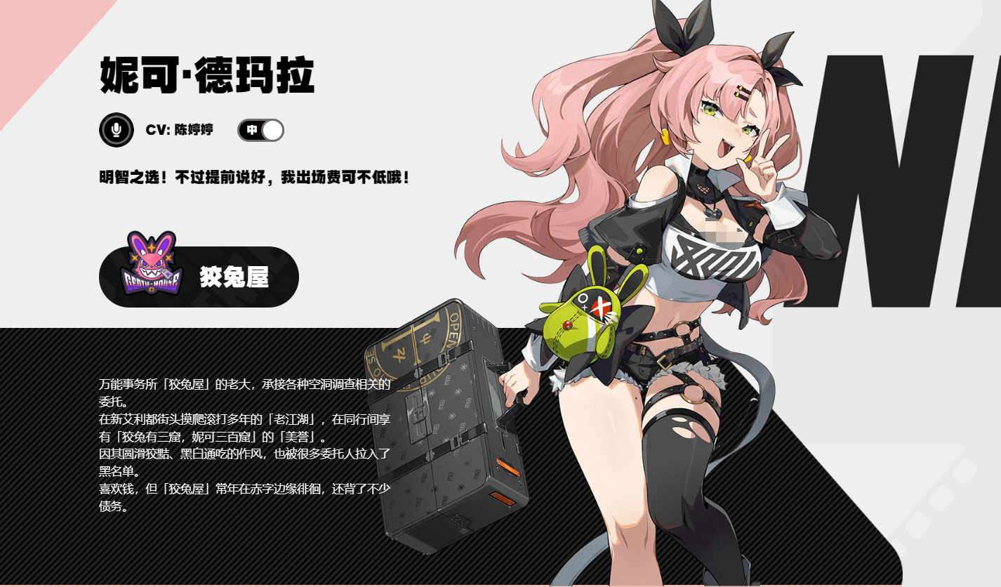 第四个角色的名字叫做【妮可】。相信对于妮可,大家已经非常熟悉了。作为狡兔窟的创始人,妮可对于狡兔窟是非常自豪的。她对自己的工作能力和工作效果感到自信,这自信来源于妮可的父亲是一名天才的科学家,即使妮可天天把“讨厌父亲”挂在嘴边。