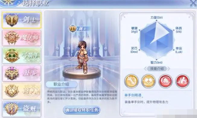 在游戏中最常用的职业就是剑士,这是一个可以进行防御和输出双重作战能力的人物,如果玩家想要转职的话,可以考虑往骑士方面转职,因为骑士各方面的能力都非常强,但是缺点就是入门的难度会高一些,转职完成之后,玩家可能会需要适应很长的时间。