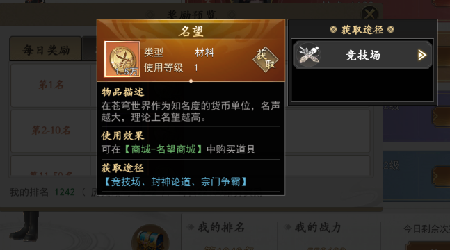 这个玩法是推荐每一个玩家都去进行参与的!同时还开设了十分有意思的竞技玩法!竞技玩法分成了两种,第一种就是普通的竞技场玩法,每天都可以挑战五次,而且是在晚上的10点按照排名来进行结算!获得第一的玩家是可以在本次玩法中领取到1.5w的声望奖励的!