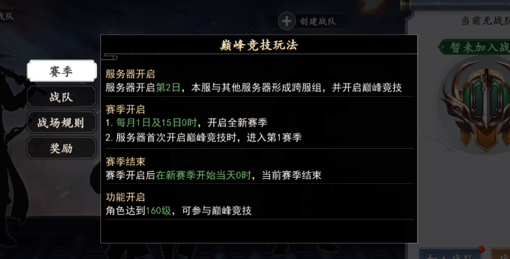 第二个就是巅峰竞技玩法,这是就需要大家去创建队伍来进行比赛了,这个比赛大家可以选择创建或者加入战斗,可以选择跨服组队!而且这个属于赛季制度的,大家可以根据选择来进行操作!不过体验这个模式也是有要求的,是需要大家等级达到160级的时候,才会开启的!