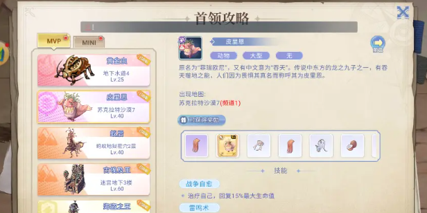 皮里恩属于一个强大的首领,是一种大型的动物类型,一般位置是在舒克拉特沙漠七区域。虽然并没有什么额外的属性,但如果玩家遇到一定要小心