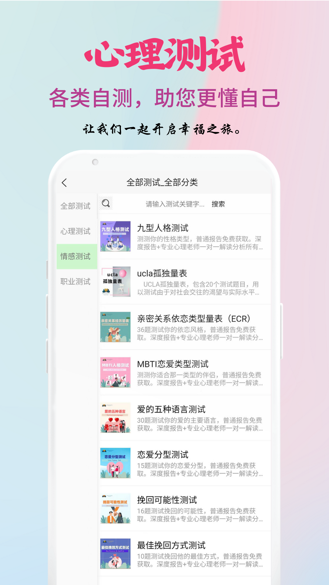 它是专业的情感问题咨询平台,在里面大家能看到很多不同的功能,为用户提供了一对一的情感问题咨询,此外还有心理测试和线上课程等功能各位到时也可去轻松的解锁,满足用户的学习和体验。