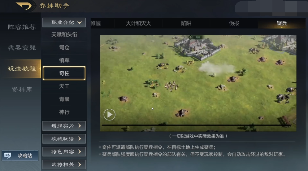 这款游戏新增了职业玩法,有镇军、神行、奇佐、青囊、天工和司仓这六个职业让玩家们选择,这就代表了能快速掌握对角色的操作,毕竟都选择了自身最擅长的职业角色,接下来就要交给新手们怎么选择职业。【奇佐】职业的智商是最高的,对各种作战策略都了如指掌,面对一切的战局都能找到适合使用的计策,帮助友方取胜,适合策略性强的玩家们。
