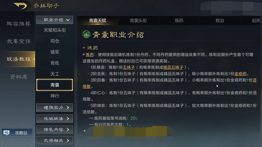 【青囊】会帮助队友恢复血量,加长打战时间,为每一次开战提供辅助,但考验新手的操作灵敏度,先保护自身的安全才能确保队友能收到治疗。