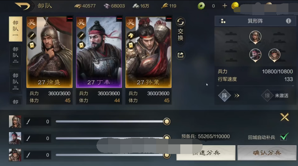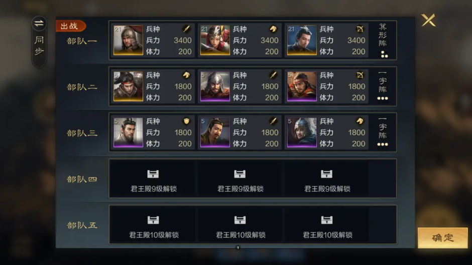 游戏战斗系统有兵种克制的玩法,例如盾克弓、弓克枪、枪克骑、骑克盾,所以要根据敌方出战的兵种而选择这边哪些士兵与他们对抗。兵种之间可以有不同的阵型,最终为阵容加的属性是不一样的,推荐使用鱼鳞阵,提升前方躲避的速度。