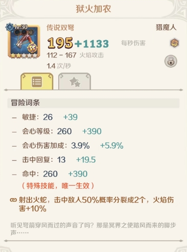 同时冒险模式下它的词条和技能也都相当厉害,词条包含了敏捷,会心等级,会心伤害,击中回复和命中这五种属性,对于输出,回复都有增益。