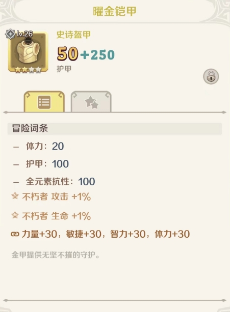 至于后面的盔甲,靴子,项链和戒指则可以都用曜金系列搞定,这些防具提供的基础属性都很不错,主要是特效均能提供“力量”,“敏捷”,“智力”和“体力”这些核心属性的增益!