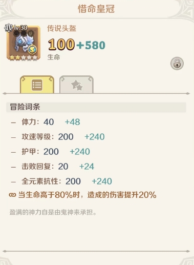 除却武器以外,头盔的搭配也尤为重要,这里推荐搭配“惜命皇冠”,这一装备的基础属性是100点生命,后续强化到三十级还能额外再增加580的血量,此外,它的其他词条也相当厉害,这些词条包含了额外的体力,攻速等级,护甲,击败回复以及全元素抗性,这些属性能对玩家起到全面的增幅,包含额外的承伤属性以及续航和回复。