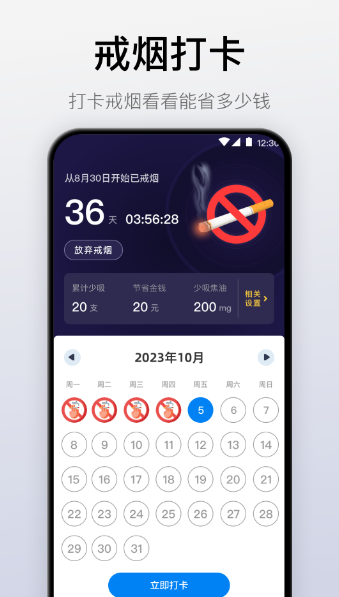 通过软件的打卡程序帮助用户逐渐减少抽烟次数,首先设定好戒烟的目标及计划时间,就能根据就计划来每天打卡了,看着自己的打卡记录很有成就感。