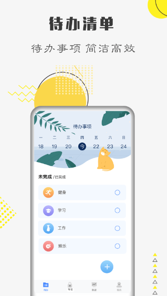 列出每天的待办事项,完成一个就能勾选消除一个,软件采用番茄工作法来锁定手机,帮助用户专注完成工作,还有正计时、倒计时等辅助功能。