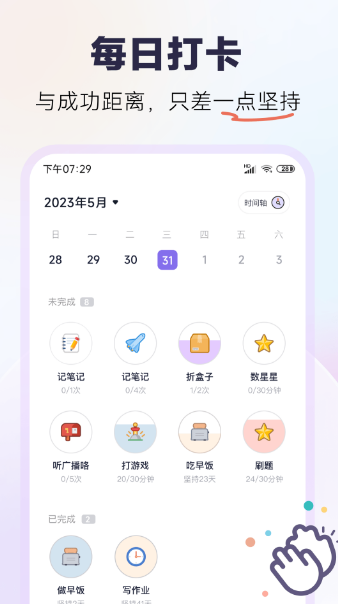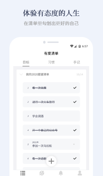 立下目标和愿望,就能通过坚持打卡来实现目标了,目标不用设立得很远大,可以从每天看书30分钟开始做起,一步步养成自律的习惯,软件也会帮大家记录实现的过程。